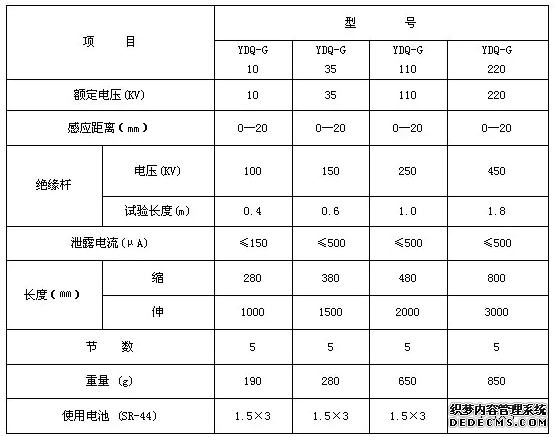 感应交声光验电器声光讯号指示强度:报警发声指示强度(1m处70Dd,25m处可闻),超高亮度红色闪光指示强度(红色闪光,15m外直接光照可见).验电器始终处于备用状态,当电池电压降低不足时,本指示器声光讯号微弱,即应更换电池.验电器接触及电极上突然接触电压时起至指示器清晰无线电台示之间的延迟时间(即响应时间)<=1秒,返回系数>=0.95